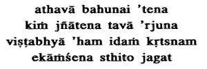42. But, of what avail to thee is this vast things being known, O Arjuna ? I stand sustaining this whole world by one part (of Myself).Of what avail to you can be this .knowledge of vast but imperfect details Listen, I will tell you completely of it. I stand sustaining firmly this whole world by one part, by one limb, by one foot ; i.e one part of Myself constitutes all beings. So says the chant: