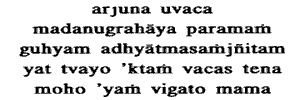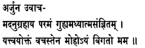 1. Arjuna said:By that speech which has been delivered by Thee for my benefit,that highest secret which is called Adhyatma,this, my delusion, is gone. Adhyatma: that which treats of the distinction between the Self and the nonSelf. Delusion: nondiscrimination.