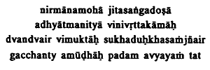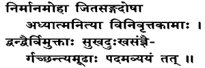 5. Free from pride and delusion, with the evil of attachment conquered, ever dwelling in the Self, their desires having completely turned away, liberated from the pairs of opposites known as pleasure and pain, the undeluded reach that Goal Eternal. Dwelling, etc: constantly engaged in the contemplation of the nature of the Supreme Self. Their desire, etc: they become samnyasins, all desires having fled without leaving any taint behind. That: described above. The Goal is the Lords Glorious Being.The Goal is again specified thus: