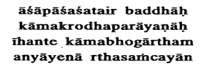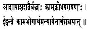 12. Bound by hundreds of bands of hope, given over to lust and wrath, they strive to secure by unjust means hoards of wealth for sensual enjoyment. They are attracted here and there, bound by a hundred bands of false hopes. They secure wealth for sensual enjoyment, not for (performing acts of) dharma: By unjust means: by robbing other men's wealth. The materialists aspiration. Their aspiration is expressed as follows: