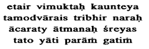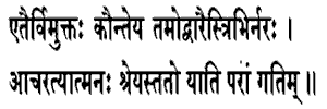 22. A man who is released from these, the three gates to darkness, O son of Kunti, does good to the self, and thereby reaches the Supreme Goal. (Gates to darkness: leading to hell (narakai which is full of gain and delusion. He who is released from lust, wrath and greed will act for the good of the self, because of the absence of that by which obstructed be has not hitherto so acted. By so doing he even attains moksha. Let the Law guide thy Life. The scripture (sastra) is the authority on which all this renunciation of asuric nature and the observance of what is good are based. One would engage in these only on the authority of the scriptures (sastra), not otherwise. Therefore,
