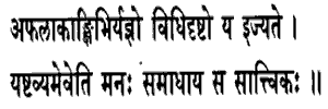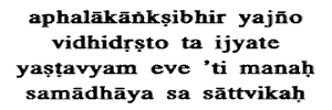11. That worship is Sattvic which is offered by men desiring no fruit, as enjoined in the Law, with a fixed resolve in the mind that they should merely worship. That they should merely worship: that their duty lies in the mere performance of the worship itself, that no personal end bas to be achieved by that means.