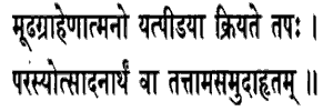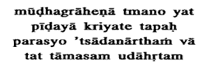 19. The austerity which is practiced out of a foolish notion with selftorture, or for the purpose of ruining another, is declared to be Tamasic. The three kinds of Gift. Now the threefold nature of gift will be described.