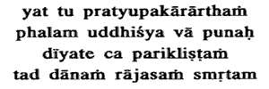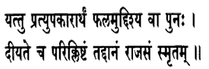 21. And that gift which is given with a view to a return of the good, or looking for the fruit, or reluctantly, that gift is held to be Rajasic. With, a flew etc.: hoping that he (the done) will in time return the service, or that the gift will secure for himself some (now) unseen reward. .