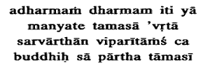 32. That which, enveloped in darkness, sees adharma as dharma and all things perverted, that intellect, O Partha, is Tamasic. It takes quite a perverted view of all things to be known. sattvic Firmness.