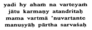 23. For, should I not ever engage in action, unwearied, men would in all matters follow My path, U son of Pritha, My: I being the chief among men. And what harm is there in that ?The Lord says: