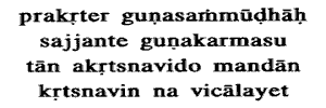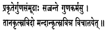29. Those deluded by the energies of Nature are attached to the functions of the energies. He who knows the All should not unsettle the unwise who know not the All.The foolish believe we do action for the sake of its result. These men who are attached to action look only to the result of their actions. The man who knows the Allthe man who knows the Selfshould not of himself unsettle such men, i e he should not disturb their conviction.How an aspirant for Moksha should do actions.How then should action be performed by the ignorant man who seeks moksha and who is qualified for action only The answer follows: